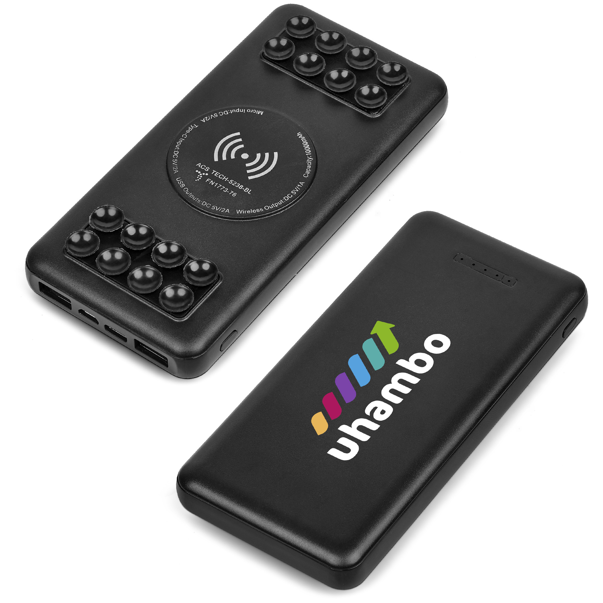 Wireless Charging Power bank. This useful power bank can charge most phones from 0 – 100% around 3 – 4 times (depending on the battery capacity of the phone) before needing to be recharged itself. If your phone has wireless charging capability, you can attach it to this power bank by using the suction pads. This will enable you to charge your phone while still using it, and without a cable getting in your way. The two USB ports enable you to charge more than one device at the same time.
